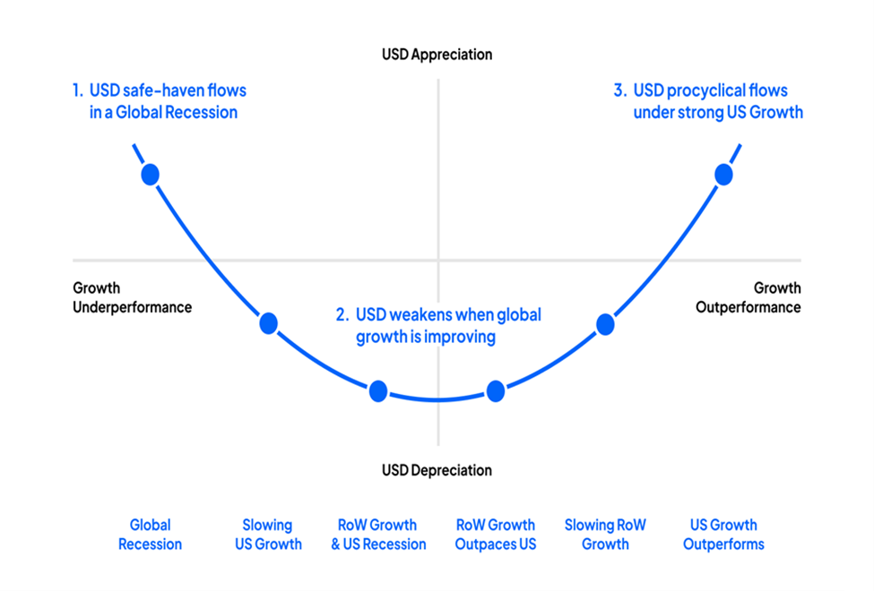 美元“微笑”理论 – 要理解目前的基本面,我们可以回顾一下美元“微笑”的概念。简单来说,这个理论描绘了这样一个模型:美元在“避险情绪”(股市下跌/波动性上升)、全球经济数据放缓以及美国经济看起来“异常”时表现出色。