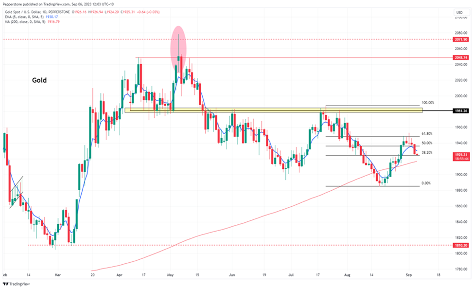 XAUUSD – 价格已经反弹至7月至8月下行区间的61.8%斐波那契水平,即1948美元,明显受到更强劲的美元表现的影响。随着美国名义和实际利率的上升,我们看到持有无收益资产的机会成本影响了投资者的心态。最近,50日和200日均线都表现出了吸引力,这表明均值回归策略可能值得采用,但如果跌破1917美元,可能会看到1900美元甚至1884美元的出现。