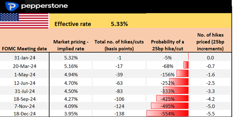 美国CPI(1月12日 00:30 AEDT)- 这是本周的主要事件风险,因此请关注这一关键数据点的风险敞口。市场预计广义CPI环比涨0.2%/同比涨3.2%(从3.1%),核心CPI为环比涨0.3%/同比涨3.8%(从4%)。美国掉期市场预计3月联邦公开市场委员会(FOMC)降息25个基点的概率为69%,到2024年12月累计降息140个基点 – 这种定价将在CPI数据发布后进行重新评估,相应地,美元和股市也将同步波动。
