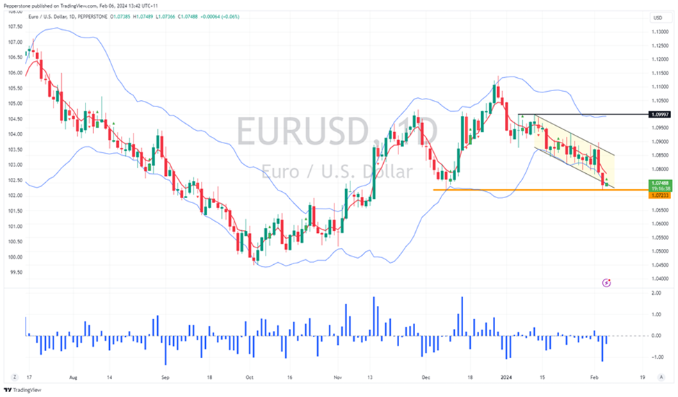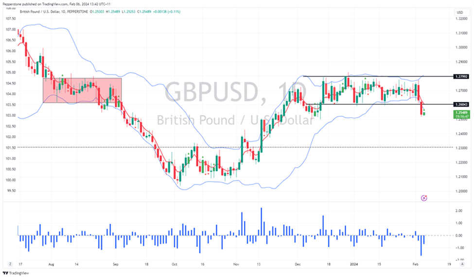 随着美国经济数据持续超出预期,而美联储对即将到来的加息持谨慎态度,我们看到美国国债相对于德国国债的收益溢价不断扩大。例如,持有美国2年期国债相对于德国2年期债券的收益溢价已经上升至185个基点(或1.85%),而在1月中旬时仅为154个基点。这对美元构成买盘,汇率推向12月的转折低点1.0723,突破了最近的通道底部。就动能而言,我们看到2日ROC已急剧下降至-1.20——需要注意的是,自 2023 年 1 月以来,在 2 日 ROC 低于 -1 的 14 次事件中,80% 的情况在第二天出现温和的空头回补反弹。然而,趋势表明这一货币对可能会继续走低,但我会考虑在收盘价跌破1.0723或上涨至1.0775时启动新的空头交易。