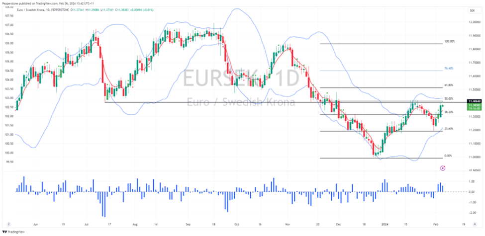 USDSEK已经完成了一个倒头肩形态,该货币对很可能随着时间的推移走高。SEK是对债券收益率上升和利率重新定价最为敏感的货币之一,因此考虑到当前全球债券市场的大环境,我们很容易看到SEK进一步表现不佳。鉴于美元货币对实际上整体同向变化(只是有不同的贝塔值),我热衷于研究交叉汇率并寻找除美元之外的机会。EURSEK具有类似的主题,但是更高债券收益率的影响,以及瑞典银行将比欧洲央行更为鸽派的前景,使得EURSEK逼近1月高位并回调了10月至1月的跌势的50%。在11.4244附近可能会有充足的供应,但在此水平上的收盘突破将是新的多头信号。