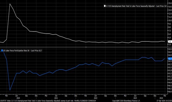 就家庭调查而言,4月份失业率可能会维持在3.8%,维持在去年第三季度以来的窄幅区间内,但从历史角度来看,仍然代表劳动力市场趋紧,并且很可能接近充分就业。同样,继 3 月份环比上升 0.2 个百分点后,4 月份劳动力参与率应保持在 62.7% 不变,参与率略低于 23 年下半年的周期高点。