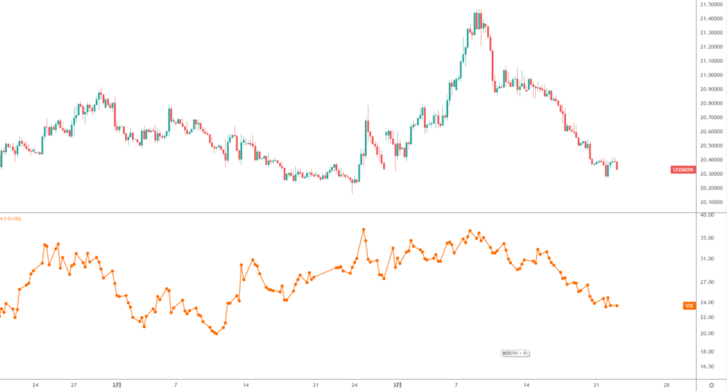 在波动率较低的时期,通过货币本身的升值很难实现高回报率,所以此时套利交易就变得非常有效。在外汇市场中,如果波动率较低,往往会导致高收益货币(例如MXN)表现强劲,而高收益股票会有更多买家。如下图所示,在四小时图周期内,随者橙色VIX指数下降,市场波动率下降;MXN墨西哥元呈现走强的势头,也就是蜡烛图中的美元兑墨西哥元走跌。