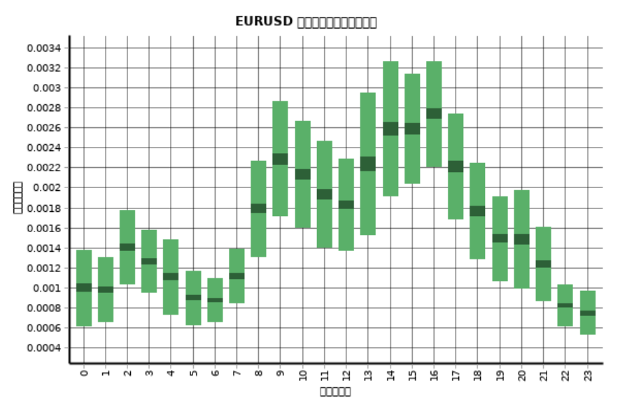 前期文章提到外汇市场的三大交易时间段,很明显欧元兑美元应该在伦敦时间段和纽约时间段波动更加明显。从Pepperstone合作提供的Autochartist波动性工具可以看出,在格林尼治时间的9点至17点,欧元有68%可能性波动更高,在统计学上有一定意义。