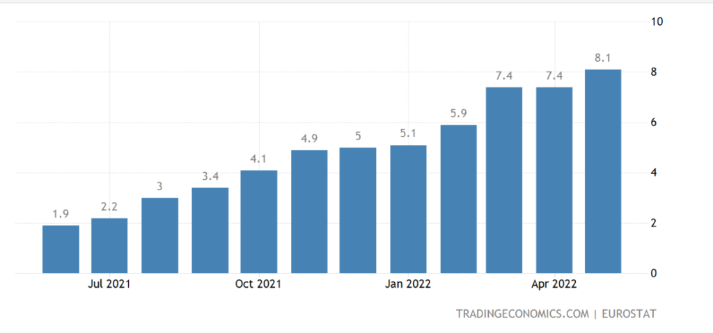 去年至今欧元兑美元大幅下跌的局面既有货币政策因素也有地缘政治因素。与美联储和英央行相比,欧洲央行尚未加息,尽管整个欧元区的通货膨胀率创历史新高,加息呼声也愈演愈烈。