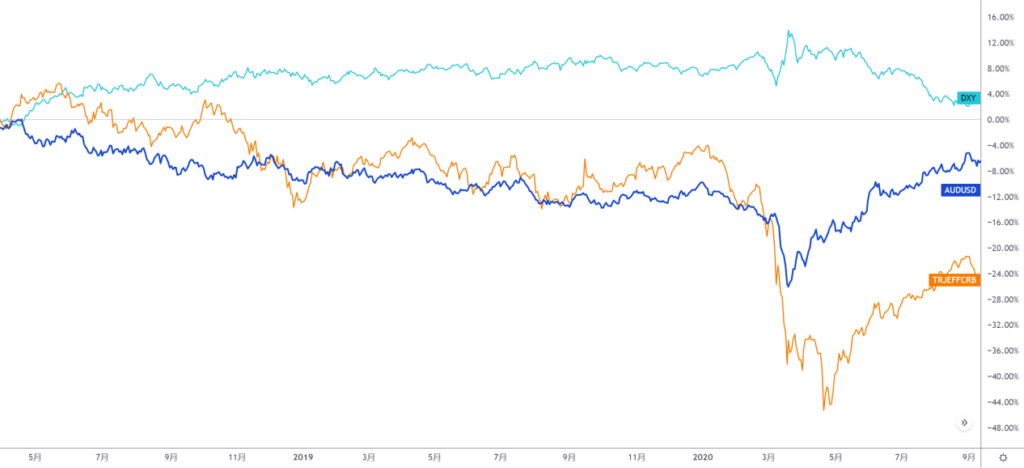 2019年之后,美元指数处横盘态势,此时由于CRB路透大宗商品指数不断下跌,大宗商品的熊市促使澳元兑美元下跌。2020年5月之后,情况则出现了逆转。