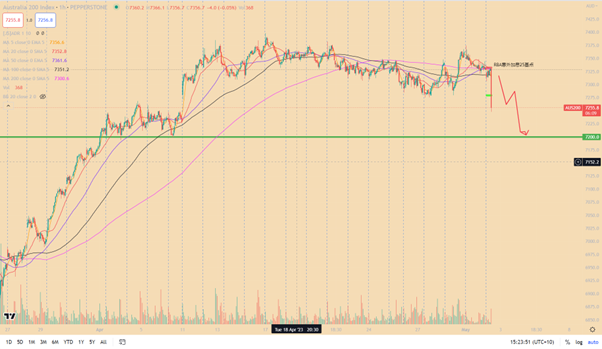 劳动节和欧洲一些列市场节日结束,第二个交易日开始,我们就被RBA澳洲央行的一个重磅“袭击“给惊醒。回想我们之前的央行背景分析,RBA在过去一直都是相对鸽派的一个央行,特别是在过去一次利率决议之后,他们的文字叙述中的用词都有明确的鸽派字眼转向,暗示未来的暂停加息预期。在上一次4月底,澳洲CPI也相对整体参差不齐,年华头条(7%vs6.9%预期,vs 7.8%前期),但整体还是符合了RBA之前对通货 “见顶转向”的曲线判断,导致了在本次利率决议之前,市场买入了将近90%的“保持”预期。 当日澳洲事件2:30PM,我们看到了RBA做出了近些年来最大的“意外“加息动作,完全不顾短期利率市场预期的买入和金融市场的稳定性,把基准利率提高了25基点到3.85%。在澳洲房地产市场最近一个季度终于出现了暂时缓解和稳定的迹象节点,RBA这个动作可以说是”前所未有“的有勇气,传达给市场一个坚决的信号,控制和打压通货还是重中之重,在其他经济体,特别是FED美联储没有完全明确进入宽松期前,不愿意被动的让澳元走低“进口通胀“。房市对次重磅的反应还需市场给与足够时间去反应验证,但是股市来看,ASX200在一小时内下挫80余点超过1%到7250的反应来看,周内避险情绪延续或还有空间。7200整数位/50天EMA移动平均附近将会是第一个对多头的测试。