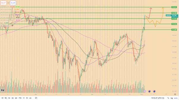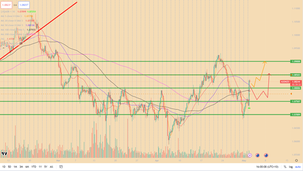 同样,AUDNZD两个大洋区的交叉盘,我们回想在上一次新西兰央行RBNZ也意外额外加息50基点后,下破了1.07整数位触碰1.06后拉回震荡,今天的最新RBA刺激,也让这个交叉盘重新在1.07起飞上破1.08,震荡区间内1.0750上方的回调,可以考虑保护接多,1.0850/1.09是重要关注阻力位。(明天早上关注新西兰就业数据,如果有利好NZD则结束策略)