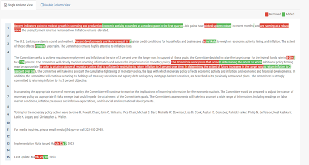 回想本周开始的市场回顾,我们看到市场是先在周初的时候被全盘超预期的美国ISM制造业数据给推动到了近期震荡区间相对高位102整数位上方。昨天的ISM服务业各项数据相对参差不齐,头条不及最小预期,51.9 vs 54预期(比上次5.12有增加),其中新订单和价格小部分超预期,在FOMC很接近的情况下,市场并没有走出太大反应,DXY在101.80附近震荡等待。进入FOMC前,利率市场已经买入了90%的25基点加息到5.15%的预期,所以市场的重心并没有放在实际加不加息的结果上,而是关注Fed对顶点和未来降息的言语和暗示,同时也对最近的各种美国小银行暴雷新闻事件看看Powell会不会有所担当。首先,从言语上来看,文字称述中,Fed基本确认了市场的鸽派预期,之前最关键的一句“未来更多的政策收紧也许会合适“被删除,而是表示也许顶点已经很接近或者已经到了,当然新的通货和劳工市场数据也不能有新的过热意外。Powell表示未来有可能的更紧的信用供给,和央行利率的滞后性,未来都会是影响实体经济的重要因素,表示银行系统目前还是” 状况良好、根基扎实“。我们看到,很多银行股在这之后都有继续的抛售(暗示之前可能有一些头寸想看到Powell给出更多的政策上的支持,而不是只是简单来一句”我们有信心“)。