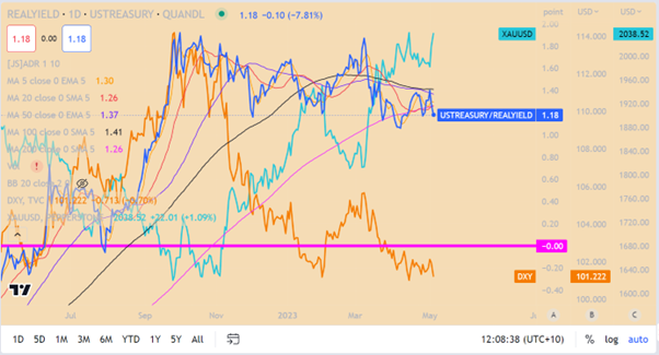 如果未来数据重新上翘,重新点燃加息预期/打消降息预期买入,短线利好美元反弹,同时打压金价,黄金技术面如找到明显技术支撑(例如上次关注的1970区间),那么这就将会是基本面避险经济萎缩和银行系统崩盘风险的黄金多头买入的新起点。如果未来通货/劳工数据继续走弱,美元趋势下降延续,那么黄金同样的反向上涨趋势或将开启金价2K开头的新时代。我们知道,在联动性上来说,黄金有2个最大联动因素,美元本身价值,和真实收益率。(真实收益率=国债实际收益率-通货预期率),我们看到,最近因为通货预期和国债收益都有相对的震荡小回调,真实收益率基本保持稳定,美元本身的波动近期在短线会和金价有比较大的反向联动。