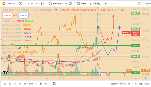 (2月DXY101.20附近,金价为1950,这次2050前高上破,同时股指下挫,信号“经济萎缩“避险头寸增量)