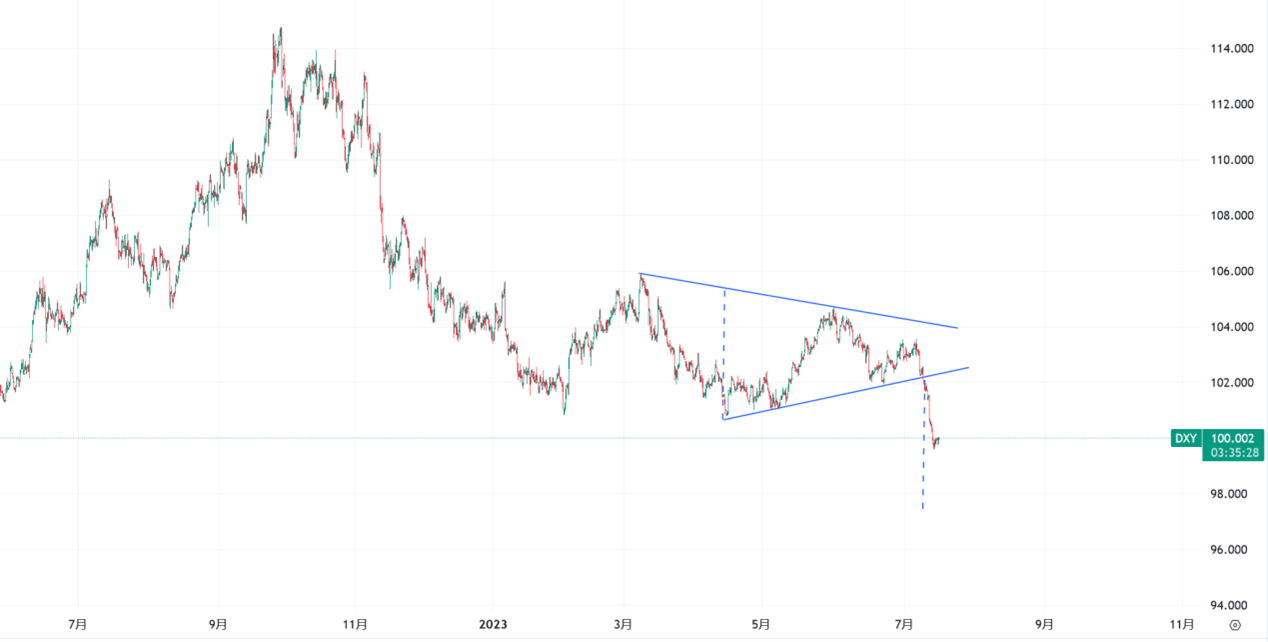 在之前的文章中曾提到美元指数形成了对称三角形,对称三角形既可以是反转结构也可以是中继结构,关键是看往那边突破。目前走势已经给出了答案,此次美元指数还跌破了2023年以来的两个最低点,目前报价低于100关口。