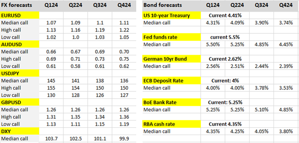 展望2024年,我们可以看到Bloomberg对EURUSD、AUDUSD、GBPUSD和USDJPY在2024年四个季度的意见调查,以及对中央银行政策利率的中值估计。我们可以看到2024年预计将是降息之年,也预计将是美元适度走弱的一年 – 一如既往,观点存在严重分歧。