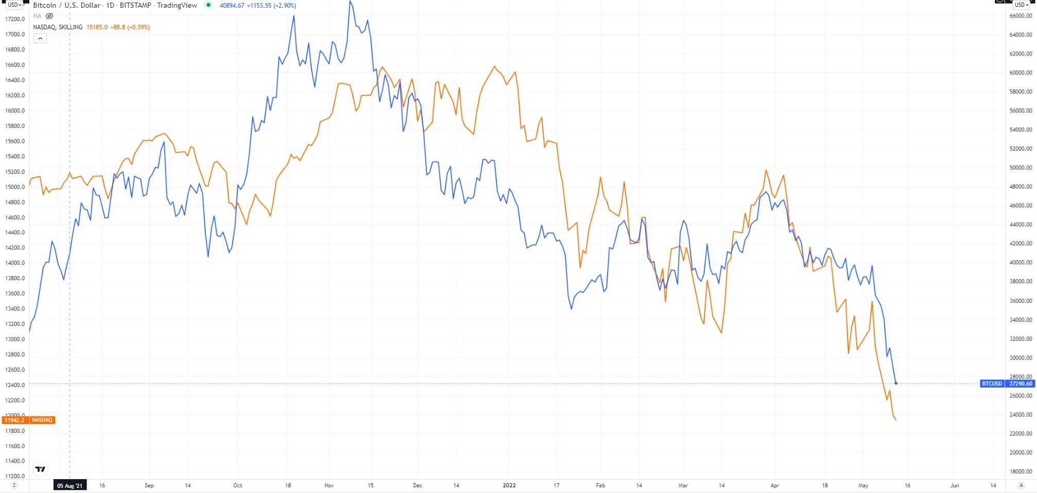 Coinbase的财报数据显示,在加密货币的交易量中,散户占比从2018年的80%降至了2021年的30%,与之相对应的是机构的参与度快速升高,而机构投资者的策略与利率环境密切相关,这一点和股市类似。当然,近来UST与美元脱钩也加速了相关币值的回落。