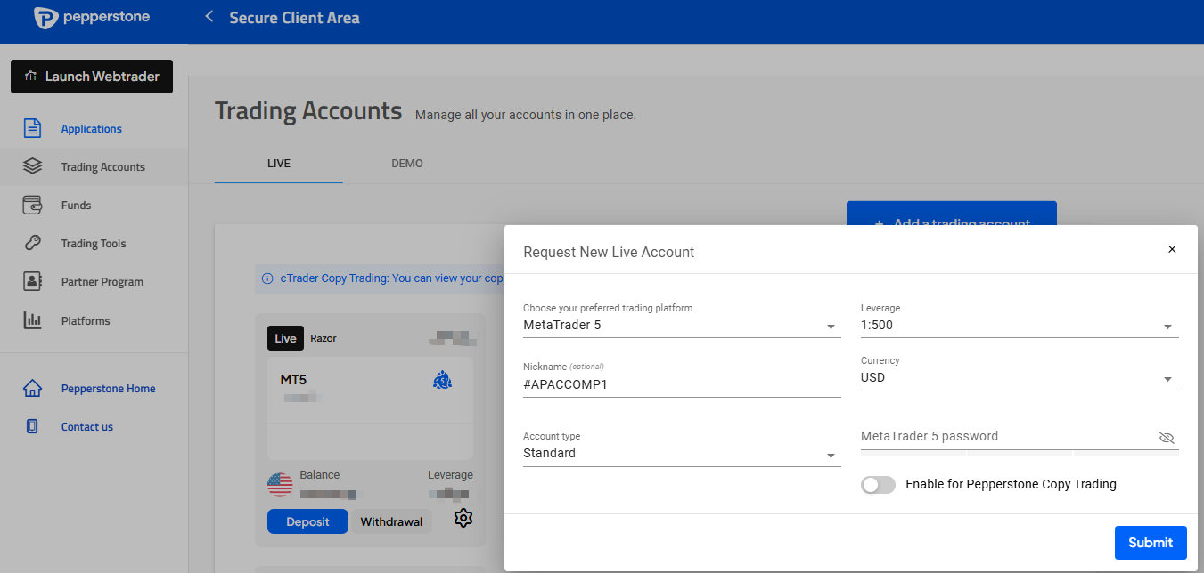- 现有客户:通过您的控制面板添加 MT5 账户