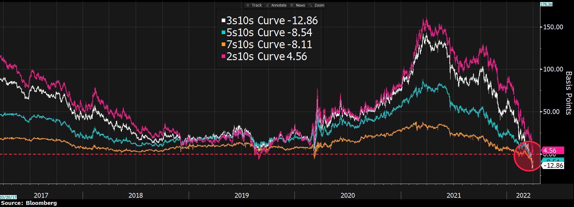 其实除了2年/10年,收益率曲线的其他不同部分在更早的时间就已经发出了类似的信号。