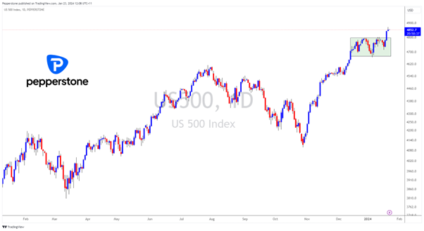 经过一段交易区间在4800-4660点之间波动的横盘整理时期之后,US500指数终于在上周五突破了这一区间,超过自2022年1月以来设定的盘中和收盘纪录,创下历史新高。这种上涨势头持续到本周,指数一度触及4870点。