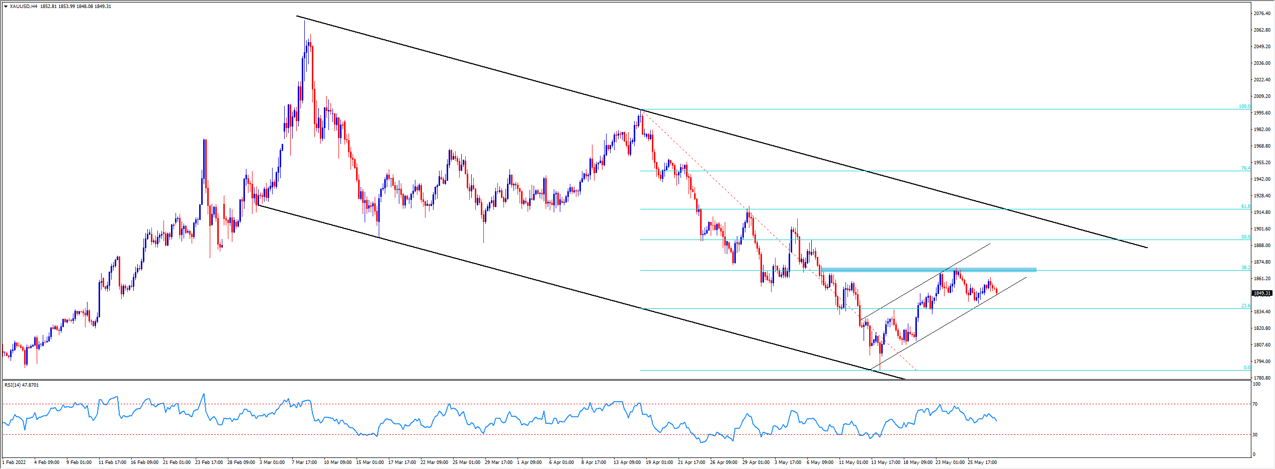 本周关注金价在5月中旬以来的上升通道中的走势,若能突破前高1866将挑战100天均线1886一线。反之跌破通道则看低至1835。