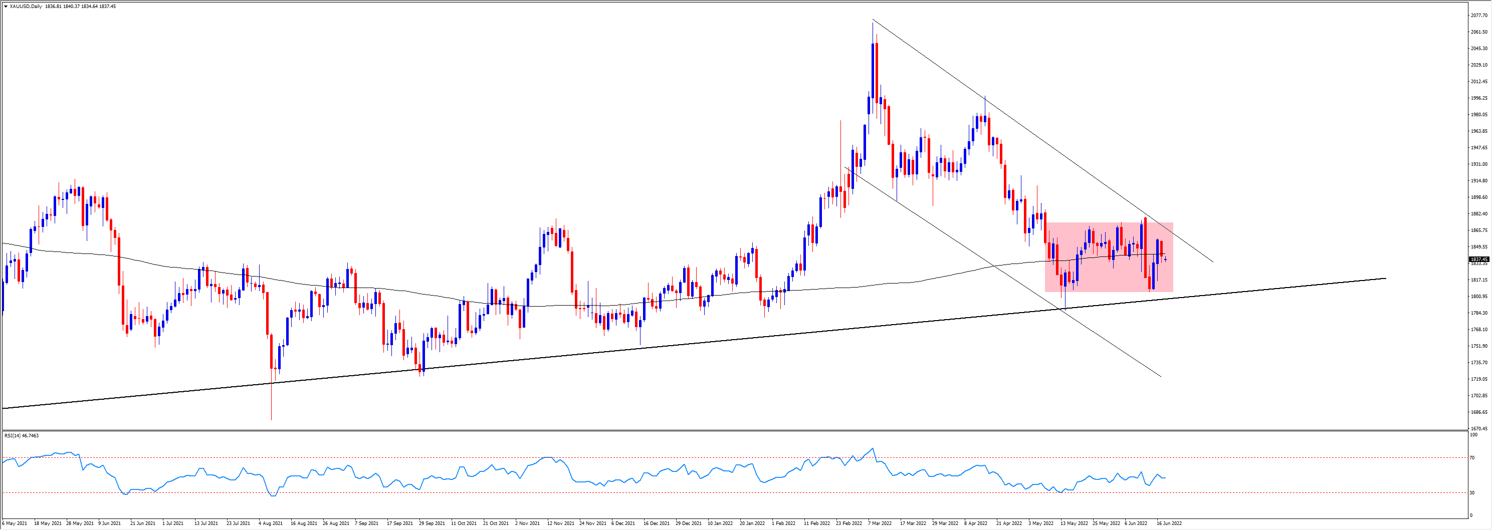 若跌破1830或将测试1800关口,这里是5和6月的低点位置,也是年初以来的趋势线所提供的支撑位。而上行方向关注1870的阻力区域。