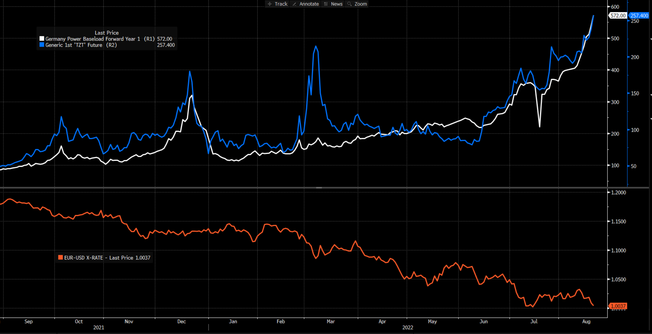 欧洲天然气(蓝)德国电价(白)vs EURUSD (橙)