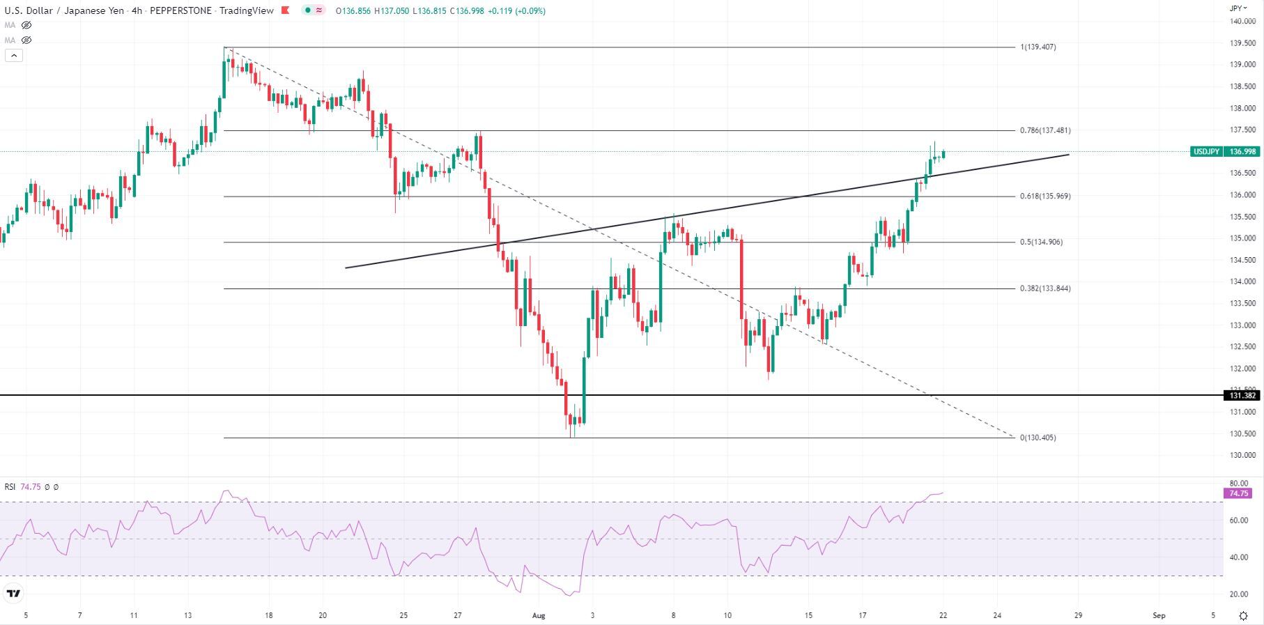 美/日在完成了对颈线的突破后,137.50和139是多头接下去的目标,但也需要留意超买的信号。